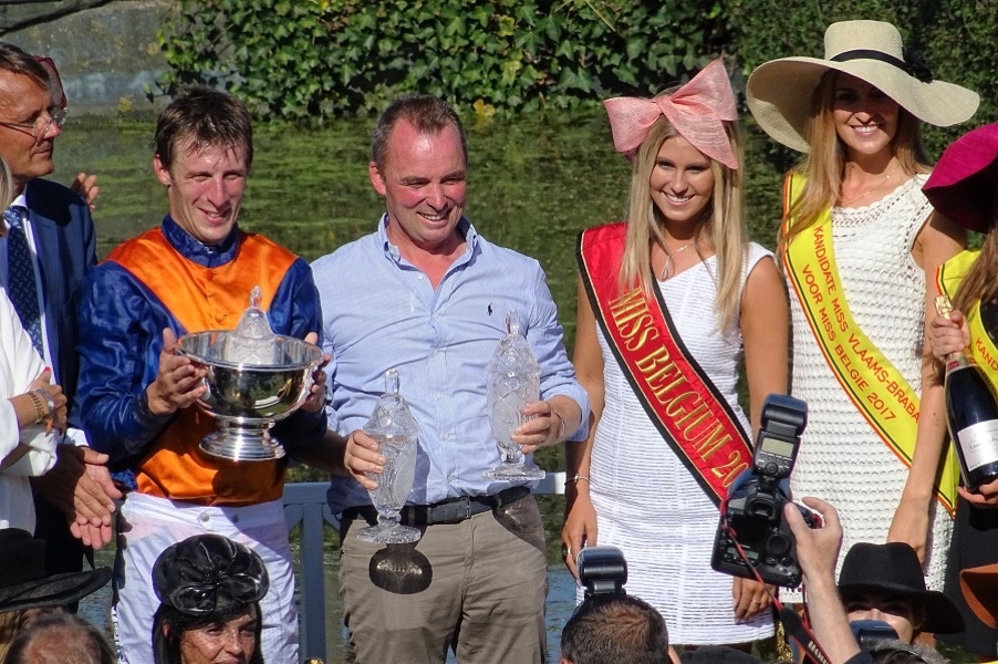 Trainer Patrice Quinton en jockey Thomas Beaurain mochten hun trofee in ontvangst nemen na de Grote Steeple