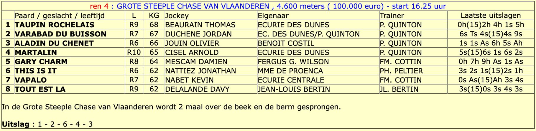 De 9-jarige Franse hengst Taupin Rochelais heeft voor het tweede opeenvolgende jaar de Grote Steeple Chase van Vlaanderen gewonnen, die dinsdag voor de 169e keer plaatsvond in Waregem. Net als vorig haar werd hij bereden door de Franse jockey Thomas Beaurain . Met Varabad du Buisson en This Is It op het podium en Martalin en Aladin du Chenet op de plaatsen vier en vijf, kleurde de volledige top vijf Frans.