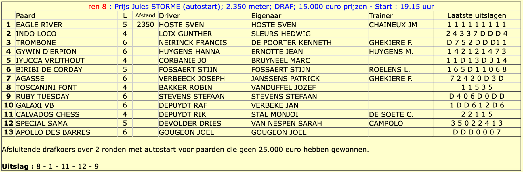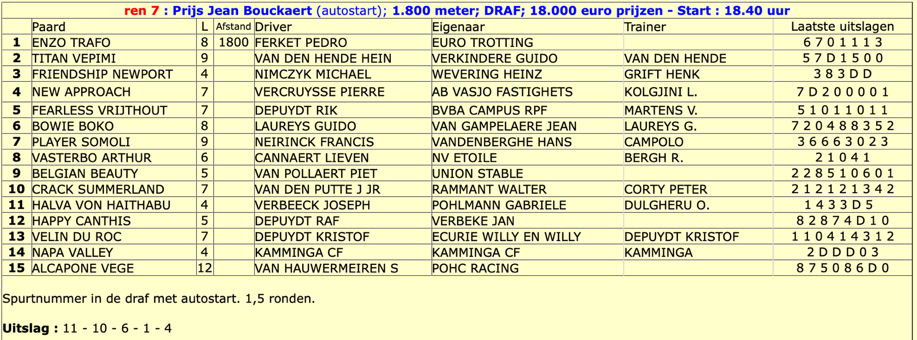 De belangrijkste drafkoers van de dag De Prijs van de Stad Waregem werd gewonnen door Ru de l'Airou (nr 12)